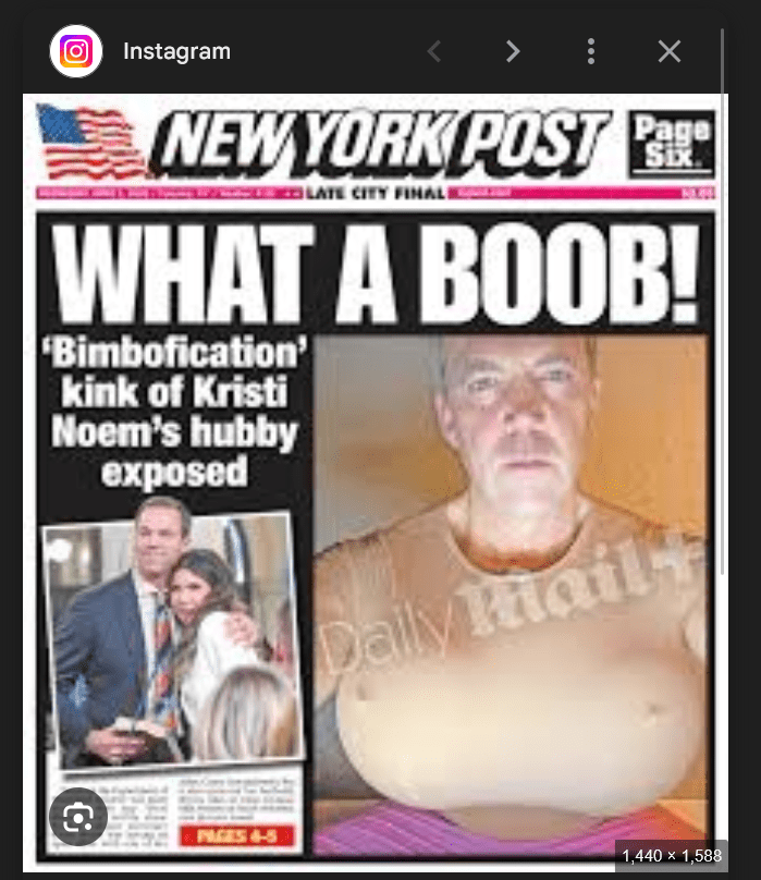 Also, Kristi Noem got fired at the beginning of March, a scapegoat for the Dept. of Homeland Security, and the ridiculousness of her $220 million video production. Then tRump gave her a new role called “Envoy for The Shield of the Americas.” WTF? Notice that says AmericaS, not North America…. Gotta LOL that her husband was *BUSTED* (<-pun!) for his bimbofication fetish. A new word for many of us, I’m sure.