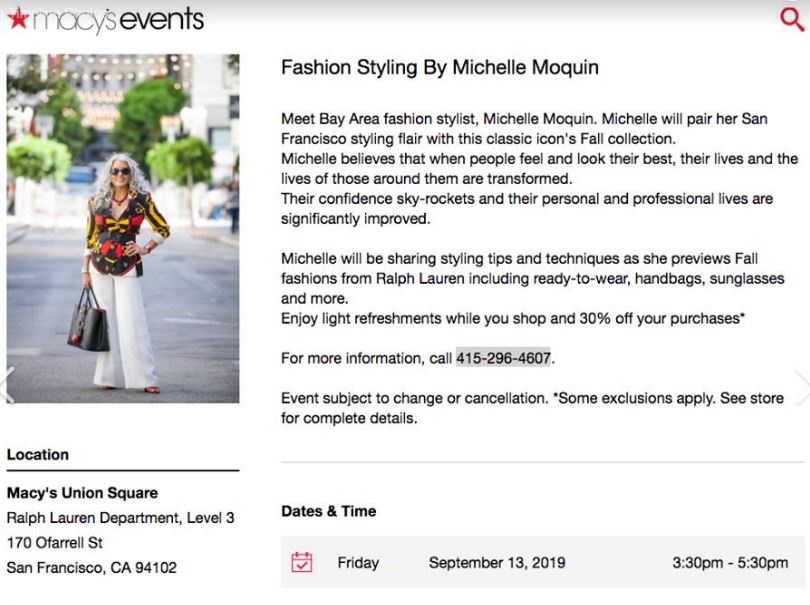For those of you missing Michelle, I have some good news for you. You have an opportunity to see her this Friday, 9/13 at the San Francisco Macy’s, Union Square.