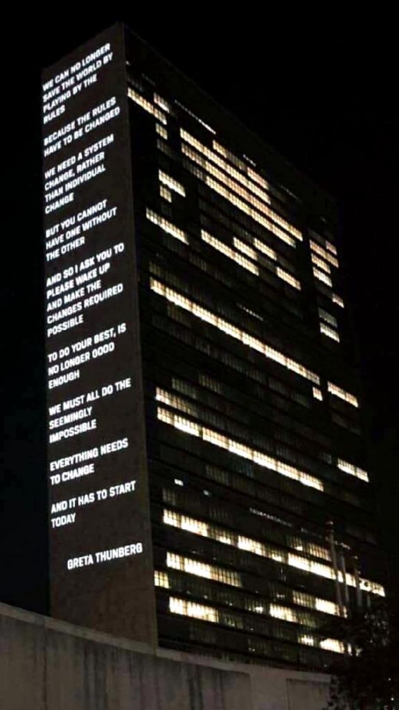 This is the side of the UN building in New York, displaying words from Greta Thunberg’s TED 2018 speech.