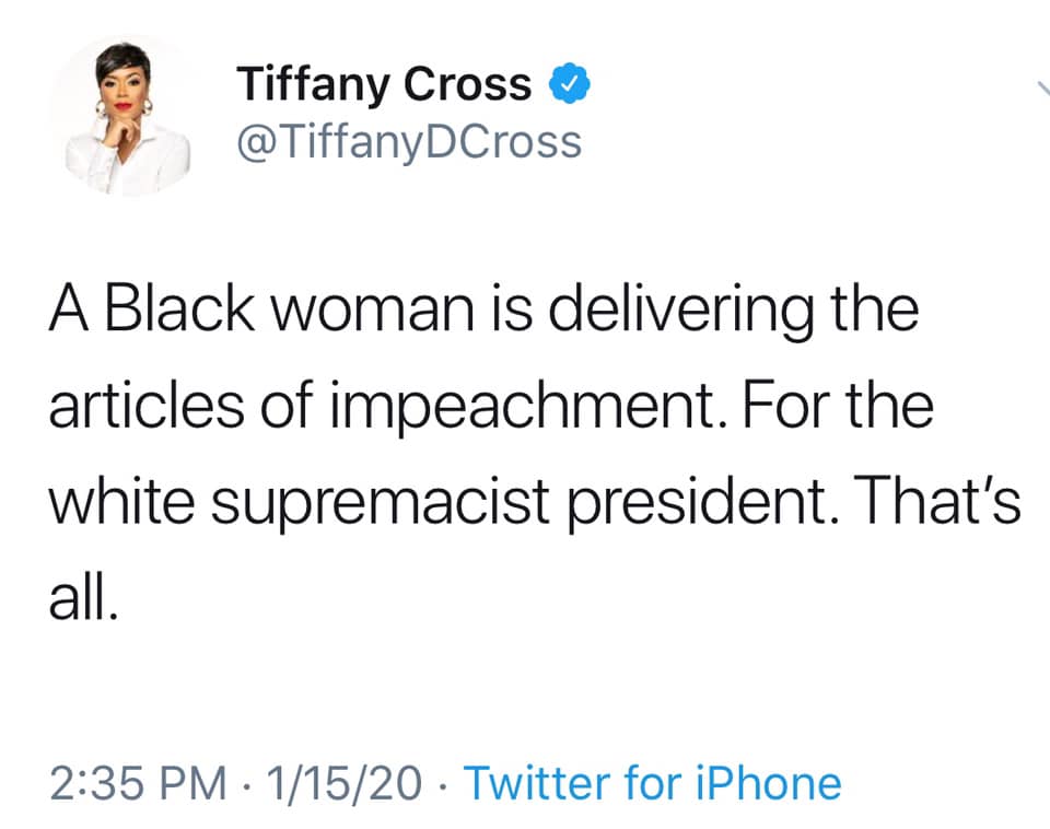 Others besides Ms. Demings who will prosecute the case against the president in the Senate are Schiff, the lead manager; Jerry Nadler of New York; Hakeem Jeffries of New York; Jason Crow of Colorado; Zoe Lofgren of California; and Sylvia Garcia of Texas.