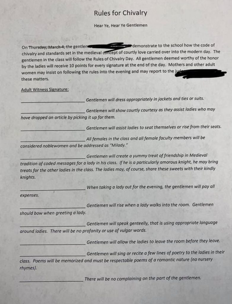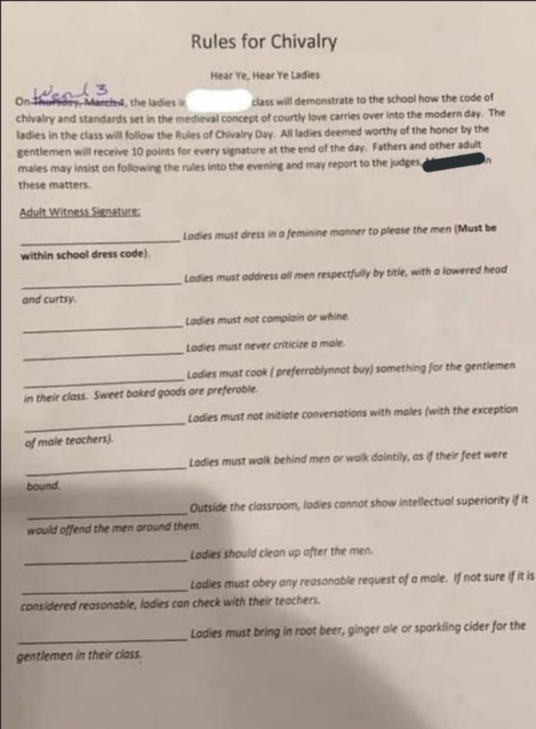 “Ladies cannot show intellectual superiority….” ! I think that is the biggest tell in this misogynist bullshit list. Ladies must “clean up after men,” “obey requests,” “don’t talk to males unless addressed,” “address them with lowered heads and a curtsy,” and walk “as if their feet were bound?!” What f’g century is this? Who is the holy roller teaching this class? Surely there are better ways to teach about medievil history (and evil does belong in that word, imho). How about reading a damn book?!