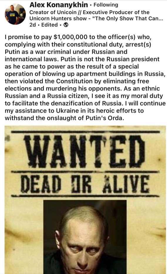 That’s the bounty that has been put upon Putin head by Russian dissident Alex Konanykhin. He put up a posts on Facebook and Linkedin and offered “$1,000,000 to the officers who, complying with their constitutional duty, arrest Putin as a war criminal under Russian and international laws.”