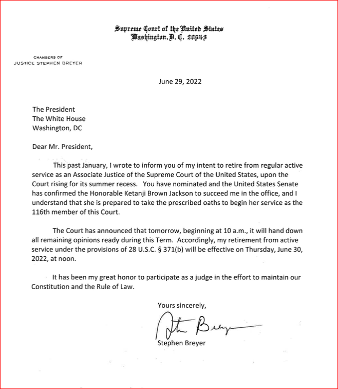 Justice Stephen Breyer has notified the White House that his retirement will be effective Thursday, June 30, at noon ET.